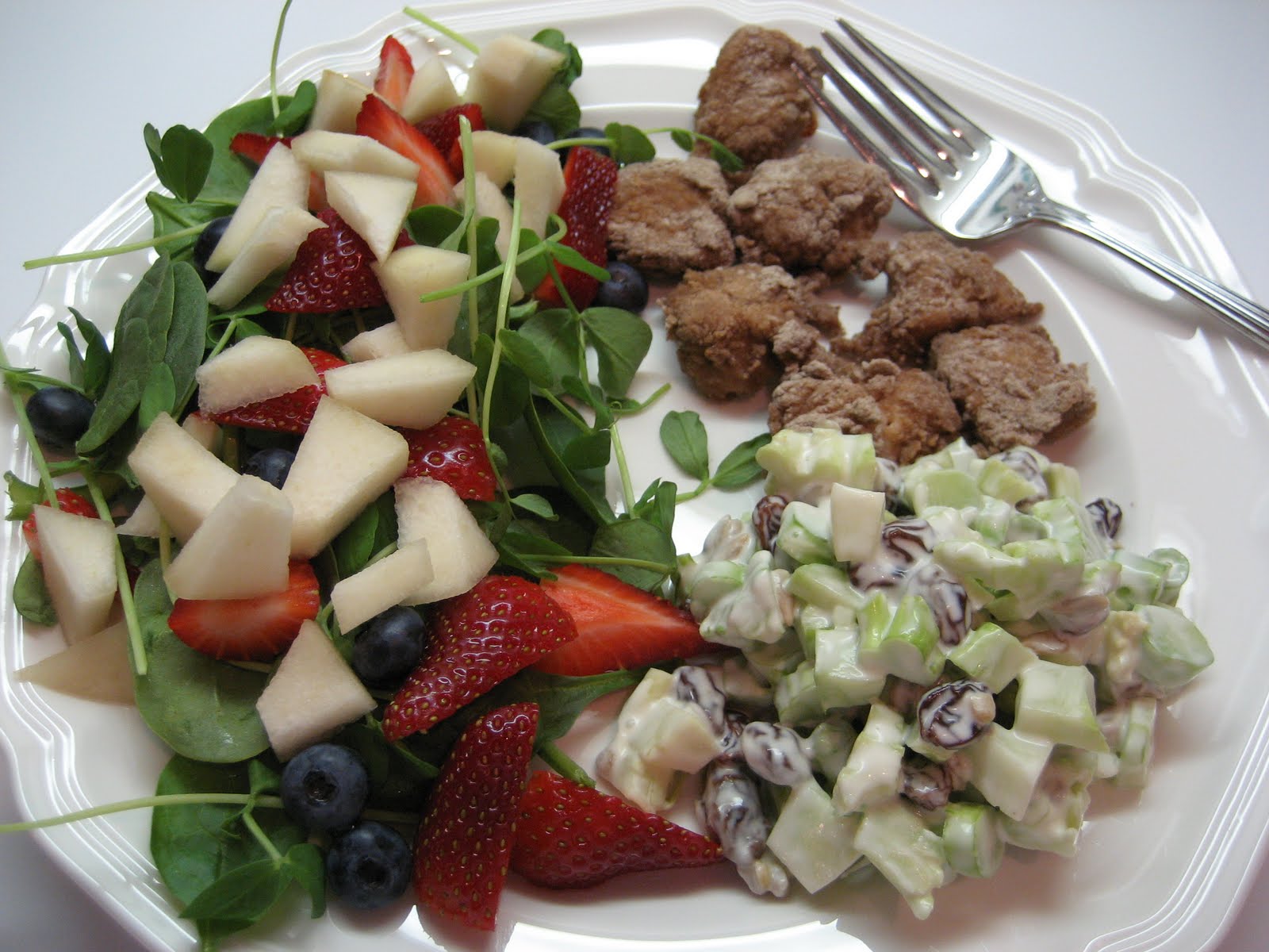 I'm loving this version of a raw broccoli salad...It's made with grapeseed oil Vegenaise, plus it has lots of healthy ingredients...sunflower seeds, green onions, apple cider vinegar, raisins...I like to have it with an orange for breakfast...I know...it's an odd choice first thing in the morning, but I like it.